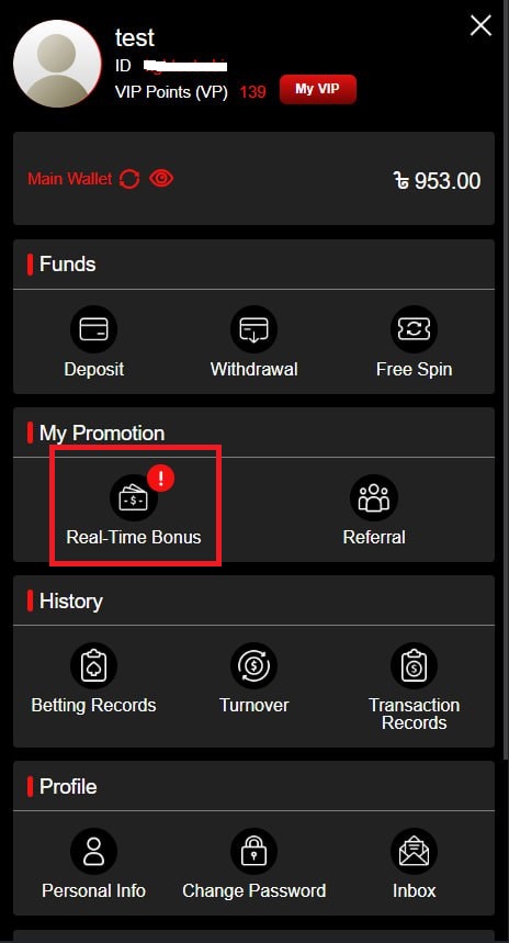 2. Go to My Account, then click the Main Wallet tab and select the Real-Time Bonus icon.