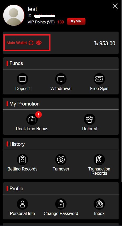 5. Return to the Main Wallet and refresh the page to check that the bonus has been credited.